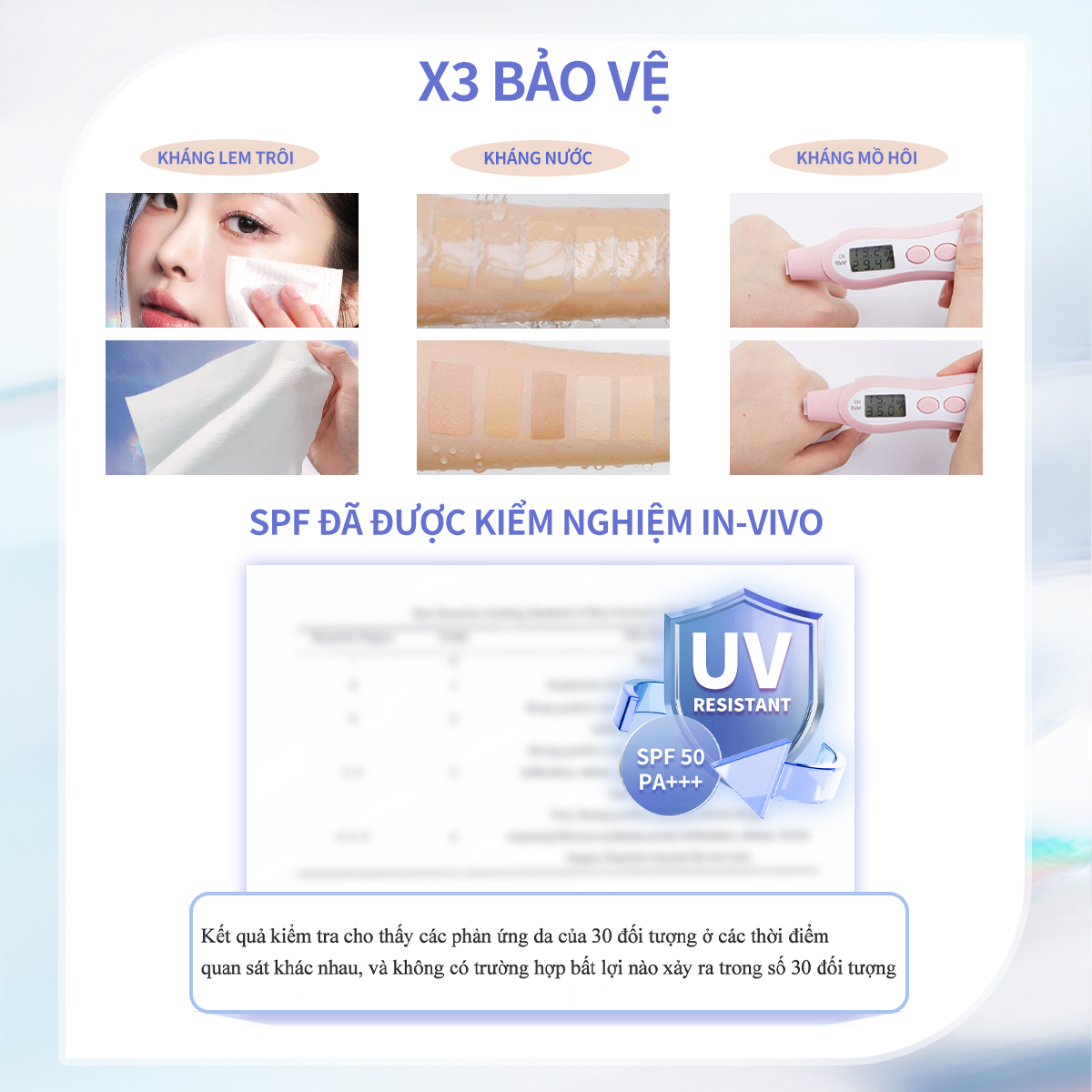 - Chỉ số SPF50 PA+++ tự tin với làn da được báo vệ dưới ánh nắng Phù hợp cho mọi loại da khác nhau .